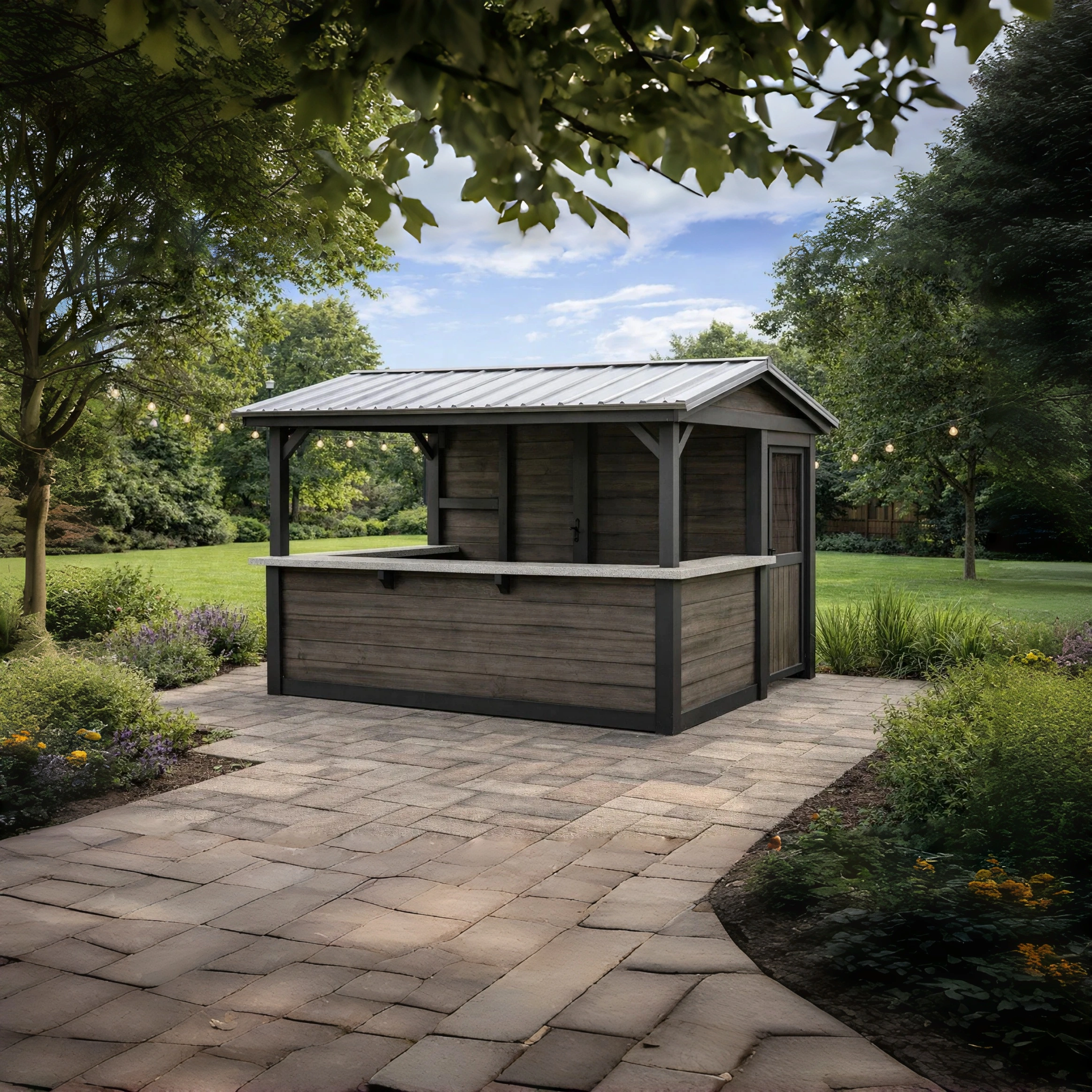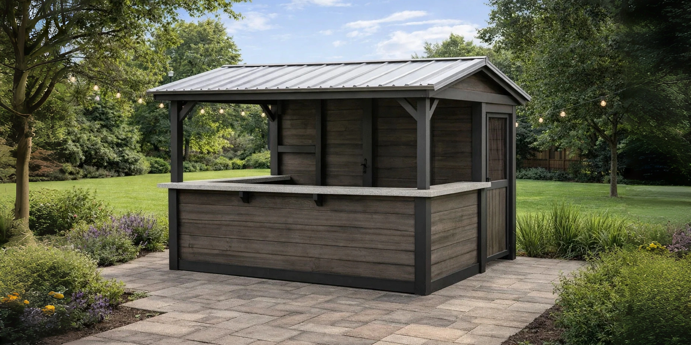 Bar exterior de madera con cubierta metálica, de uso funcional en jardín.